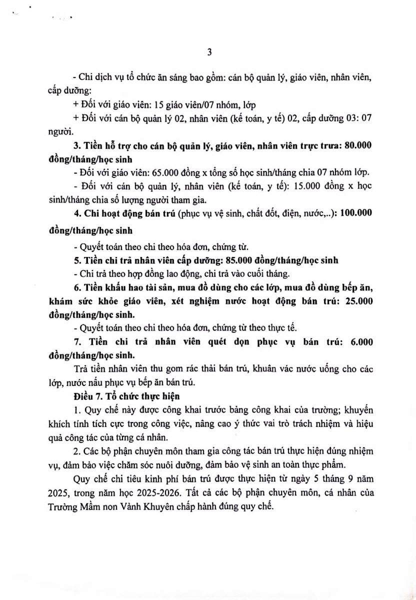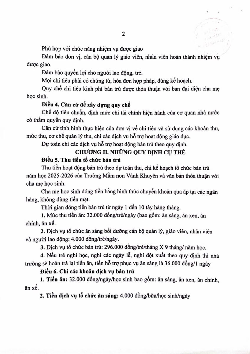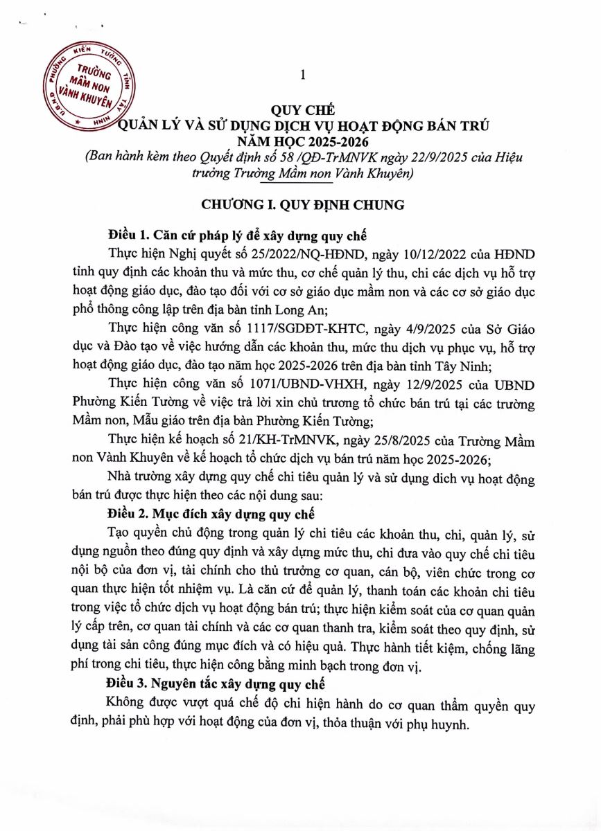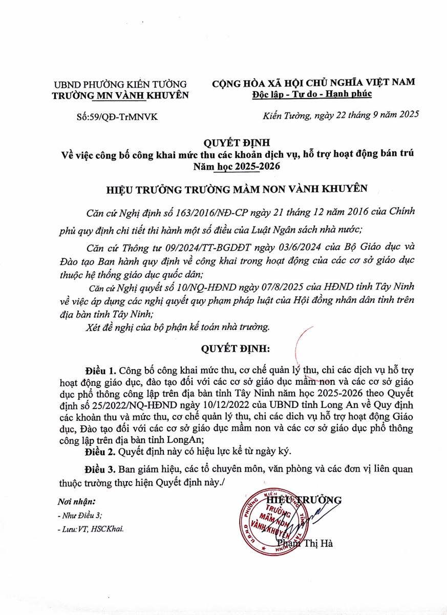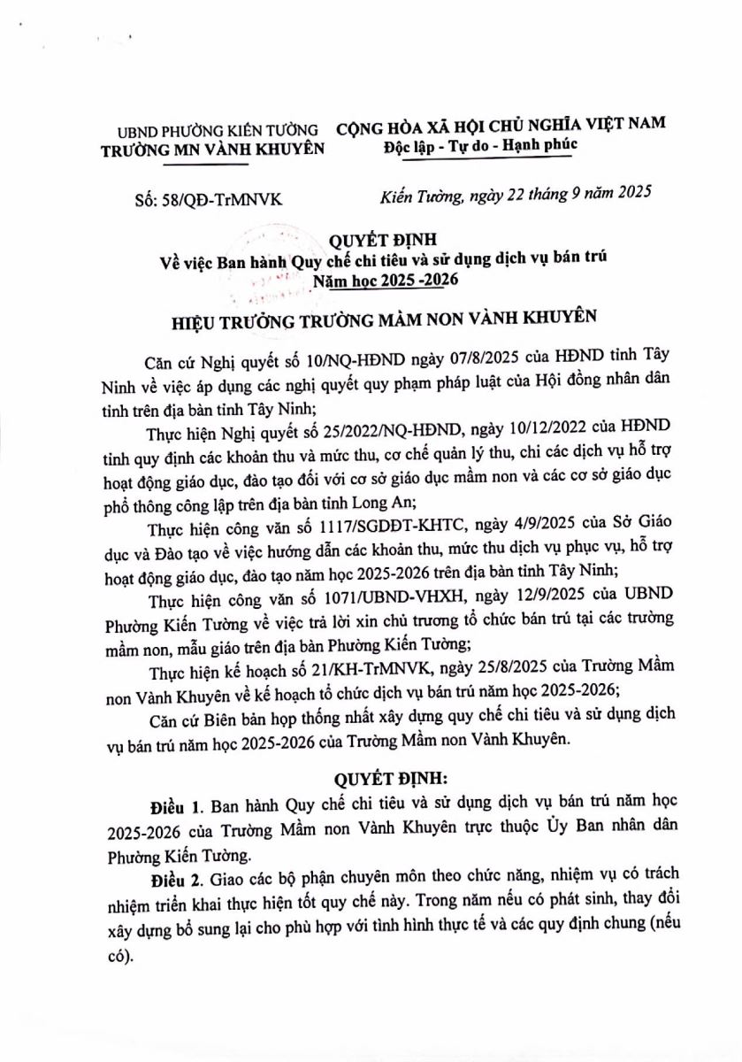QUYẾT ĐỊNH CÔNG BỐ CÔNG KHAI MỨC THU CÁC KHOẢN DỊCH VỤ, HỖ TRỢ HOẠT ĐỘNG BÁN TRÚ VÀ BAN HÀNH QUY CHẾ CHI TIÊU NĂM HỌC 2025-2026