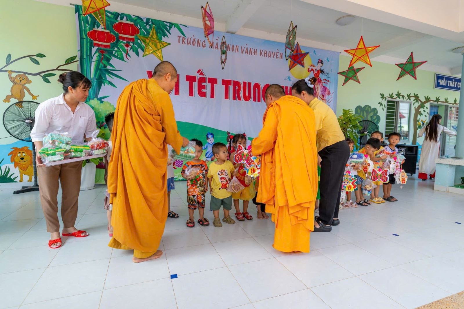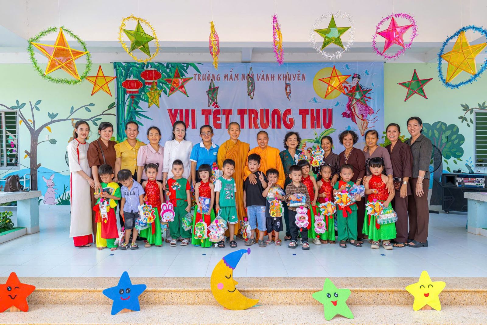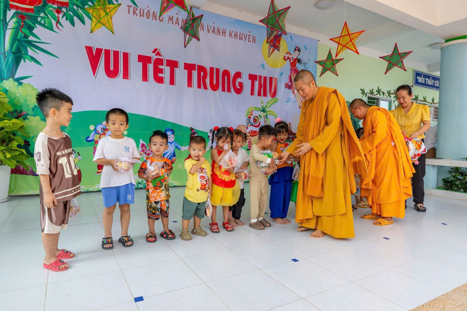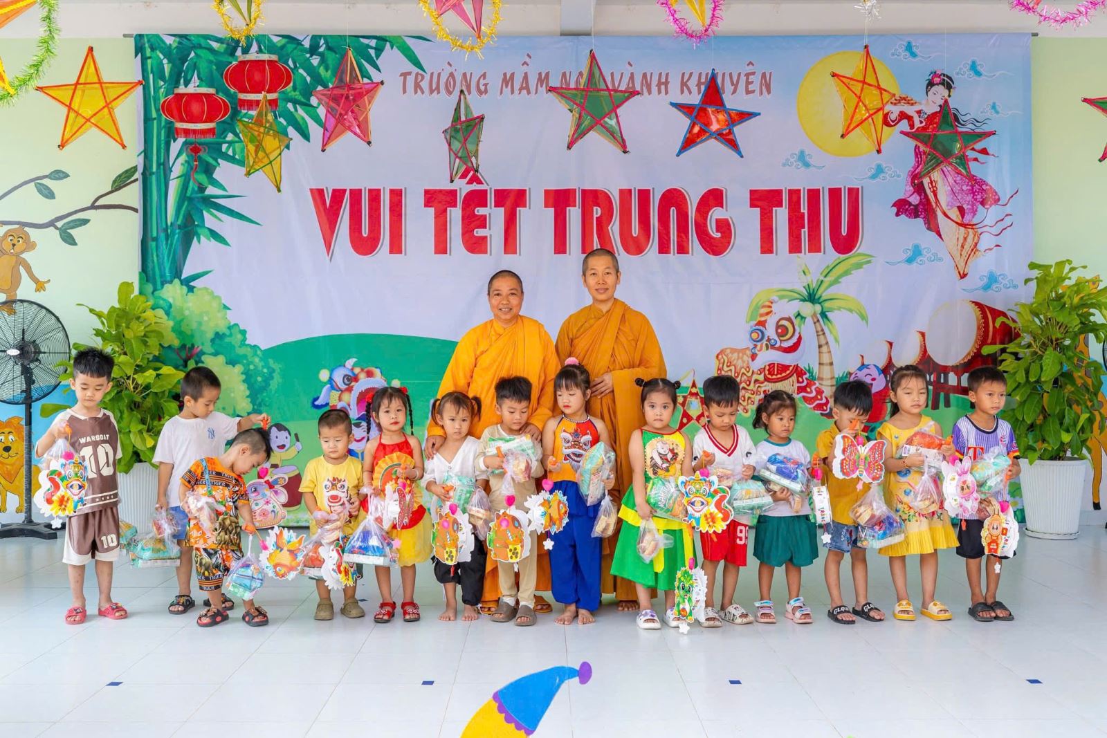 Hôm nay, Trường Mầm non Vành Khuyên đã có một mùa Trung thu thật ý nghĩa và tràn đầy niềm vui khi các bé được nhận những món quà yêu thương từ đoàn Sư cô và quý Phật tử. Những phần quà nhỏ nhưng chứa đựng tấm lòng từ bi, sự quan tâm và tình yêu thương sâu sắc dành cho các con – những mầm non tương lai. Ánh mắt rạng rỡ, nụ cười hồn nhiên của các bé chính là niềm hạnh phúc lớn nhất mà nhà trường đón nhận trong ngày hội trăng rằm năm nay. Nhà trường xin trân trọng gửi lời cảm ơn đến quý Sư cô và toàn thể quý Phật tử đã dành thời gian đến thăm, trao quà và mang đến không khí Tết Trung thu đầm ấm cho các con. Sự chung tay của quý đoàn đã góp phần làm cho năm học mới thêm trọn vẹn, để mỗi đứa trẻ đều được hưởng trọn niềm vui của ngày Tết Thiếu nhi truyền thống.